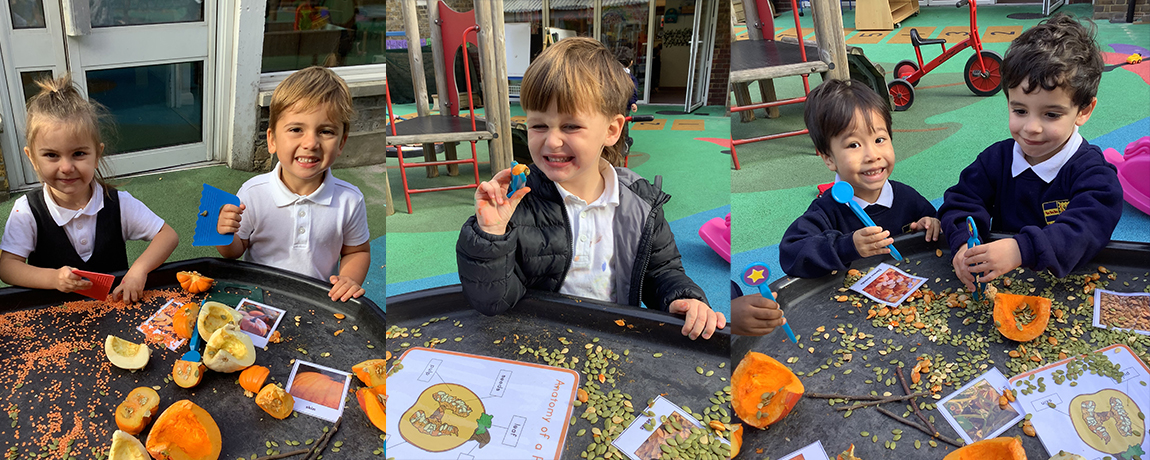 This week Nursery enjoyed exploring pumpkins as part of their Autumn themed tuff tray activity. They had lots of fun scooping out the insides and picking out the seeds. The children had ample opportunity to explore different textures, use tools to support their fine motor skills, and talk about what they found. It was a great hands-on experience that encouraged curiosity and plenty of messy fun!
