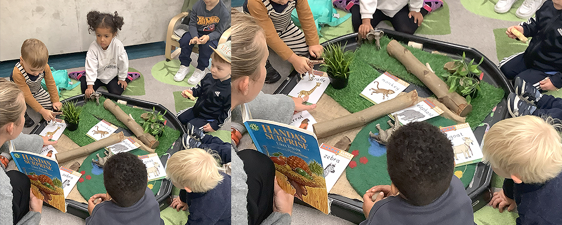 This week we explored our first core text of the year, Handa’s Surprise. The children enjoyed bringing the story to life through small world play, extending their vocabulary by naming the animals and using descriptive language to talk about how they look. We also had lots of fun exploring body movement and sounds, moving like the animals from the story.