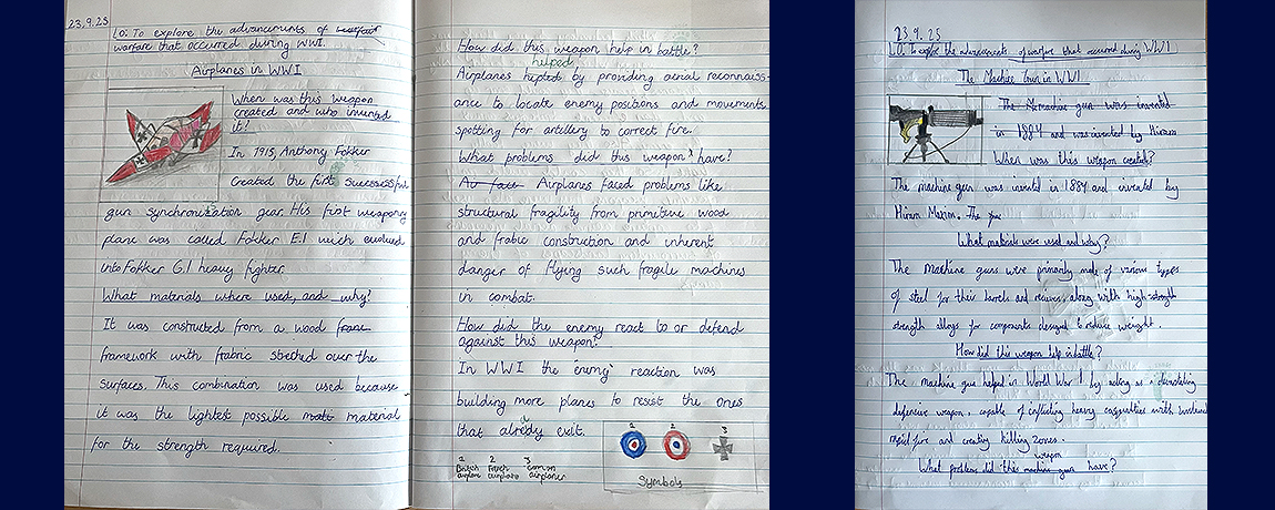 Building on this, they explored how WWI marked a turning point in warfare, with new weapons and tactics developed on an unprecedented scale. From machine guns and tanks to zeppelins and chemical warfare, they investigated the impact of these innovations and the ethical issues raised. Each pupil chose one weapon to research, finding out when and why it was created, how it was used in battle, and how the enemy responded. Through this work, Year 6 have developed a deeper understanding of both the human experience and technological change during the Great War.
