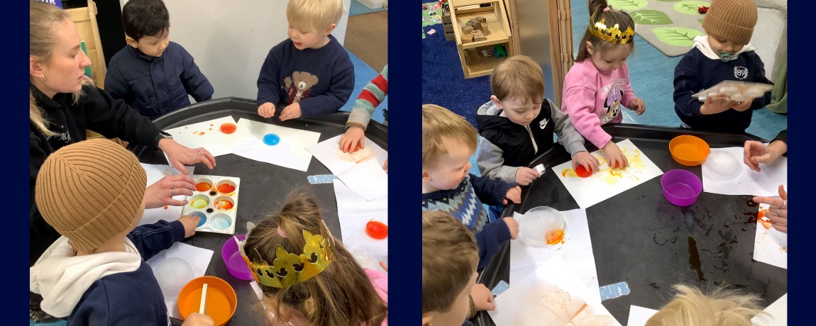 This week our two-year-old Preschoolers explored frozen ice paints! They watched the colours melt, talked about how cold they felt, and observed how the melting ice changed the paper underneath. It was a lovely sensory activity that encouraged curiosity, language, and careful observation.