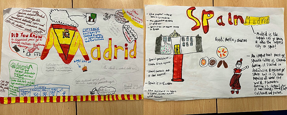 Year 5 have been learning all about Spain and its capital city Madrid. The class researched key landmarks such as the Prado Museum, Plaza Mayor, and Madrid’s beautiful parks, discovering interesting facts about Spanish culture and traditions. Working collaboratively in teams, they planned, designed and created colourful posters to showcase their learning. They demonstrated fantastic teamwork skills — sharing ideas, dividing responsibilities and supporting one another throughout the project. We are very proud of their creativity.