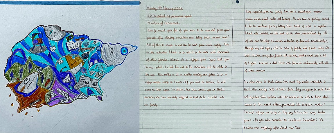 To mark Children’s Mental Health Week, Year 6 took part in a creative wellbeing activity inspired by the theme This is My Place. With practice SATs taking place, they were given time to pause and reflect on the importance of belonging and connection. Through an art activity, cthe pupils created personal “maps” showing the places, people, activities and spaces – real or imagined – where they feel safe, valued and able to be themselves. Using colour, symbols and imagery, they explored what belonging means to them, from friendships and family to hobbies, school and quiet moments of calm. The session encouraged thoughtful reflection and creativity, reminding them that looking after their mental wellbeing is just as important as academic learning, especially during busy and challenging times. Alongside this, they also published their persuasive speeches linked to our class text The Boy at the Back of the Class. Writing in role, they addressed Members of Parliament to persuade them to keep borders open so that Ahmet can be reunited with his parents – demonstrating empathy, compassion and a strong sense of social responsibility.