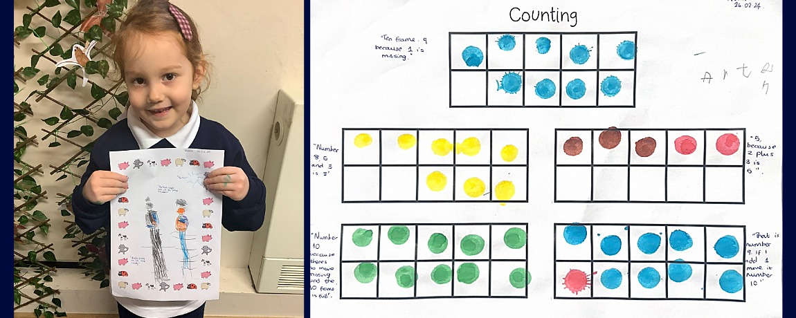 This week Nursery started reading ‘What the Ladybird Heard‘. The children were given a very important task – to help the police find two characters from the story! The children had not seen the characters and were only given descriptions of what they looked like and what they were wearing. Using their imagination, they carefully listened to the clues and created their own drawings of the characters. In Maths, we have continued learning about counting and have been using ten frames to help us recognise and represent different numbers. We have also been exploring number bonds and discovering different ways numbers can be combined to make a new number.