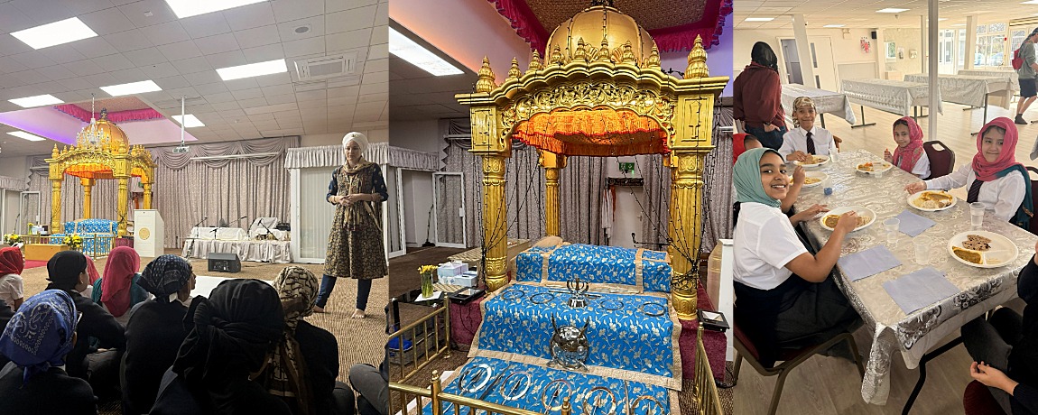 Year 5 enjoyed a fascinating and memorable visit to the Gurdwara in Ealing as part of their RE learning about Sikhism. On arrival, they showed respect by covering their hair and washing their hands before entering the main prayer hall. Inside, they listened carefully to a Sikh teacher, who explained the importance of the Ten Gurus and what each Guru contributed to the Sikh faith.