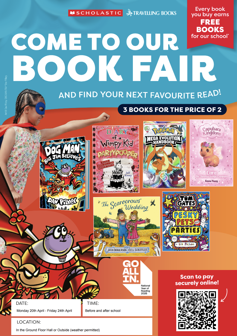 The book fair will be set out each morning 08:40 – 09:15 (Monday to Friday) and afternoon 15:30 – 15:45 and 16:30 – 16:45 Monday to Thursday) for parents and pupils to view and purchase from, in the KS1 playground just outside the school hall.
