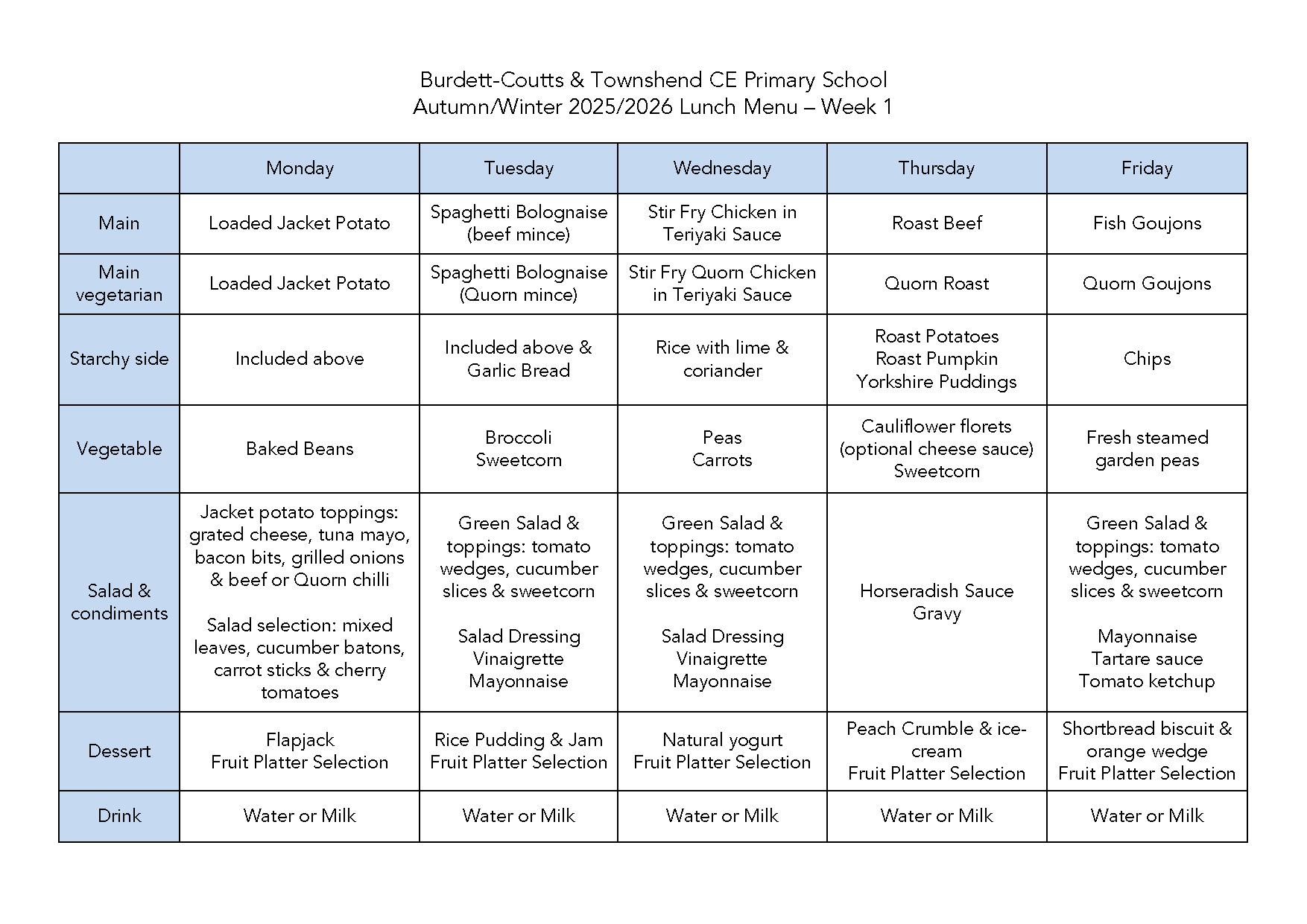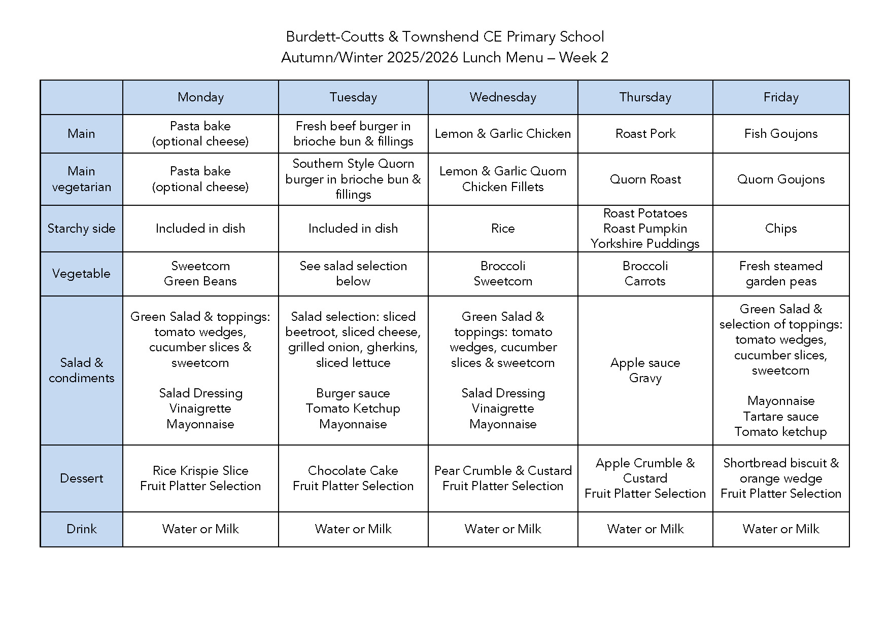 Cash or a cheque (payable to Burdett-Coutts school) for the correct amount should be paid at the beginning of each week to the school office and parents can choose to pay weekly or half termly. If your child is attending school for the first time, or you would like your child to start having school dinners, then please contact the school office to let us know.