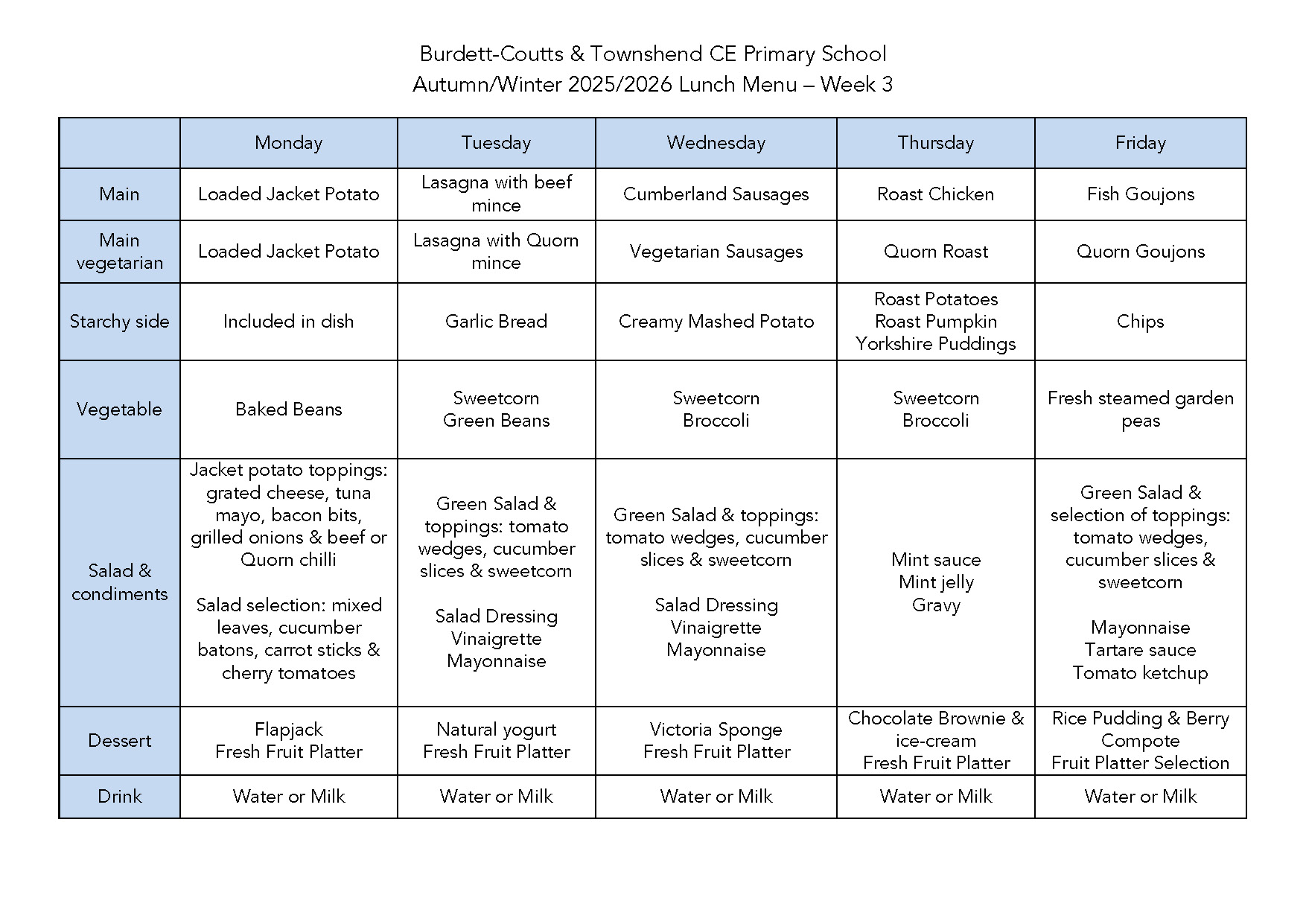 Please find our menus for the Autumn/Winter Term (3-week rotation). Alternatively you can view and/or download a copy here (PDF) or request a print-out from the school office.